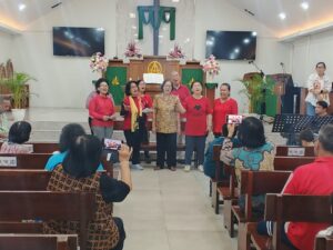 Sebelum berpisah, panitia Bulan Keluarga 2025 GKI Camar Bekasi memberikan kenang kenangan kepada Pdt Dr Charliedus R Saragih, M.M dan Ka Mega Tamba.