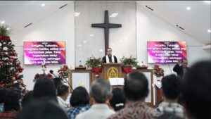 Ibadah tutup tahun 2025 ini digelar GKI Camar Bekasi di ruang ibadah utama dengan pelayanan firman Pdt Dr Charliedus R Saragih, M.M