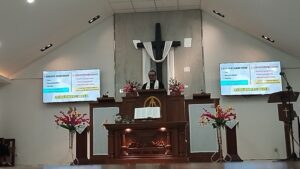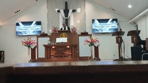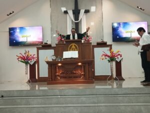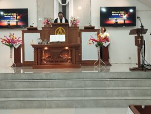 Yang dibarengi para jemaat dan simpatisan menyanyikan lagu tema pelayanan Tuhan Tolonglah Bangunkan Iman, setelah itu jemaat dan simpatisan mengambil posisi duduk untuk bersaat teduh sejenak menandakan ibadah telah selesai.
