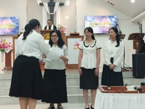 Penyerahan tanda terima kasih kepada tim BPHMJ setelah dibacakan surat keputusan yang ditanda tangani oleh Penatua Anton Purba dan sekretaris Penatua Joice Panjaitan diserahkan oleh Penatua Bianca Parlina kepada ketiga orang pengurus BPHMJ di hadapan para jemaat GKI Camar Bekasi.