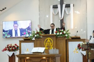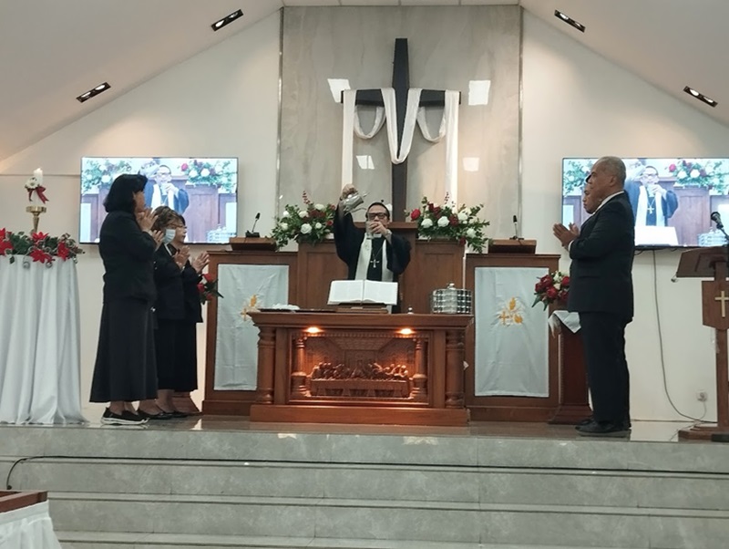 Setelah itu, Pdt Dr Charliedus R Saragih, M.M di atas nimbar dan dihadapan jemaat dan simpatisan GKI Camar Bekasi, menunangkan air anggur ke cawan lalu mengangkat cawan seraya berkata,