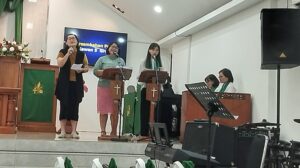 Usai saat hening, ibadah dilanjutkan dengan kesaksian pujian yang dibawakan oleh Angklung Usinda Immanuel yang berkolaborasi dengan Vocal Grup Wilayah yang membawakan pujian Hai Pujilah Tuhan (1000 reason).