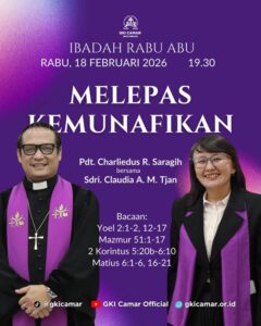 Ibadah Rabu Abu akan dilayani oleh Pdt Dr Charliedus R Saragih, M.M dan Sdri Claudia AMT, S.Si Teol dengan tema Melepas Kemunafikan dengan ayat bacaan mulai dari Yoel 2 ayat 1 hingga 2 dan dilanjutkan ayat 12 hingga 17.