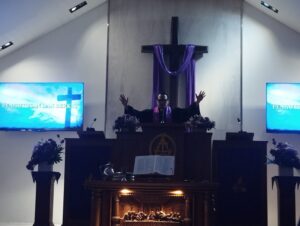 Usai menyanyikan pujian Di Dunia yang Cemar, barulah tangan Pdt Dr Charliedus R Saragih, menopang ke semua jemaat dari atas nimbar seraya berkata…