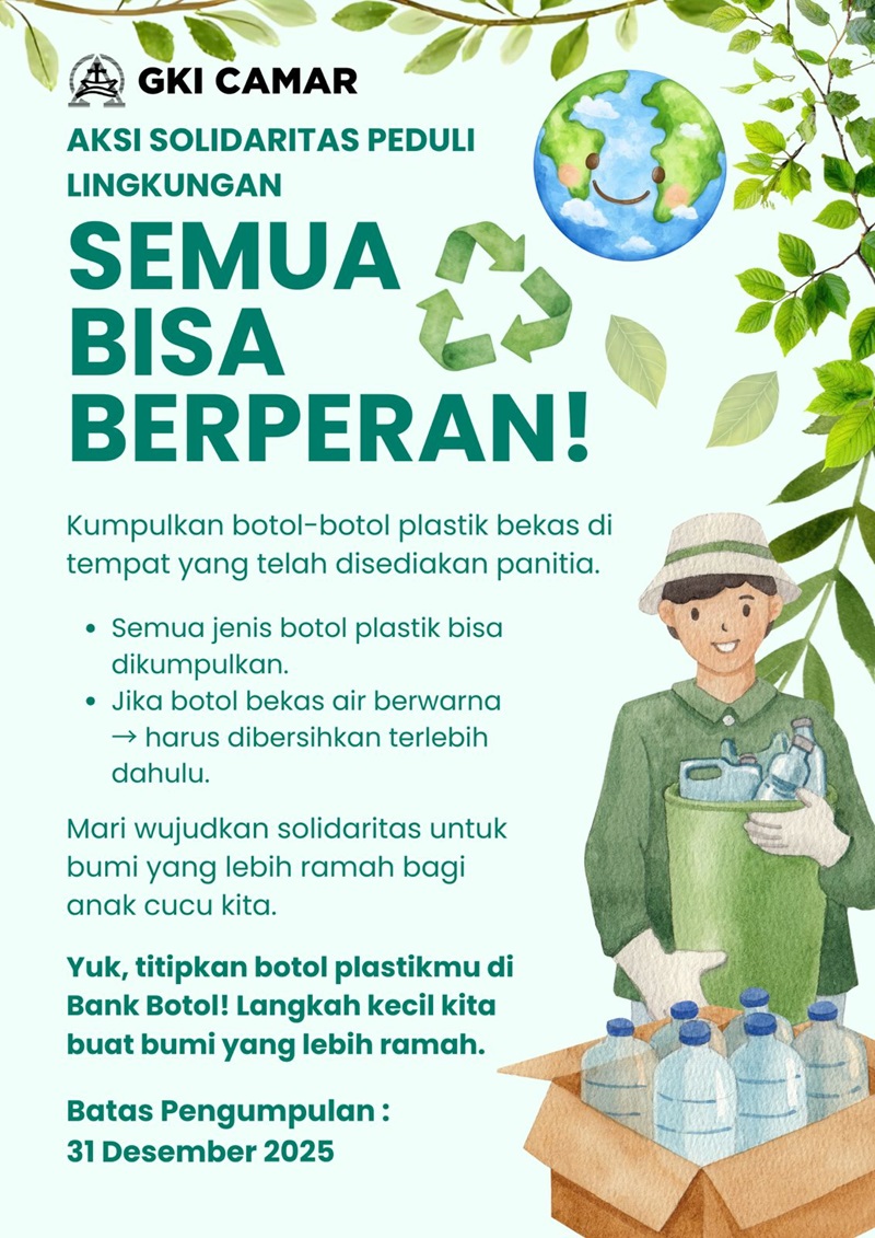 Disaat sampah terutama plastik yang semakin menjadi membuat panitia HRG Natal 2025 melakukan inisiatif untuk mengajak jemaat GKI Camar Bekasi untuk melakukan hal kecil yang bermanfaat bagi bumi yaitu mengumpulkan botol botol plastik.