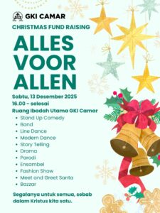 Acara yang bertajuk Christmas Fund Raising, Alles Voor Allen ini akan berlangsung di ruang ibadah GKI Camar Bekasi pada Sabtu 13 Desember 2025 mulai pukul 16.00 WIB.