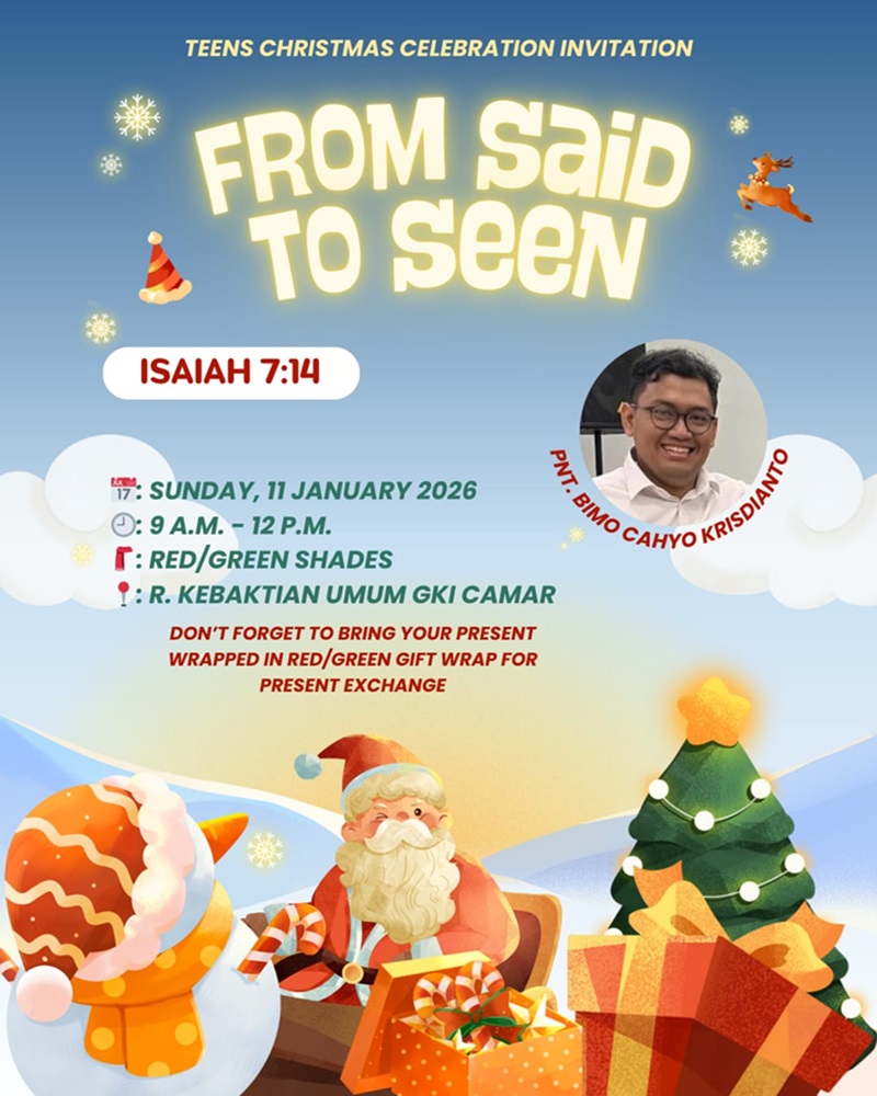 Sebagai informasi, Komisi remaja atau dikenal dengan Teens GKI Camar Bekasi akan gelar ibadah perayaan Natal dengan teman From Said to Seen yang terambil dari injil Isaiah 7 ayat 14 pada 11 Januari 2026 di ruang ibadah utama.